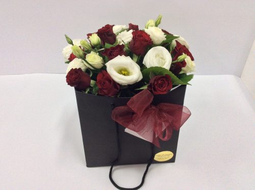 Dozen short red roses and lisianthus posie bag